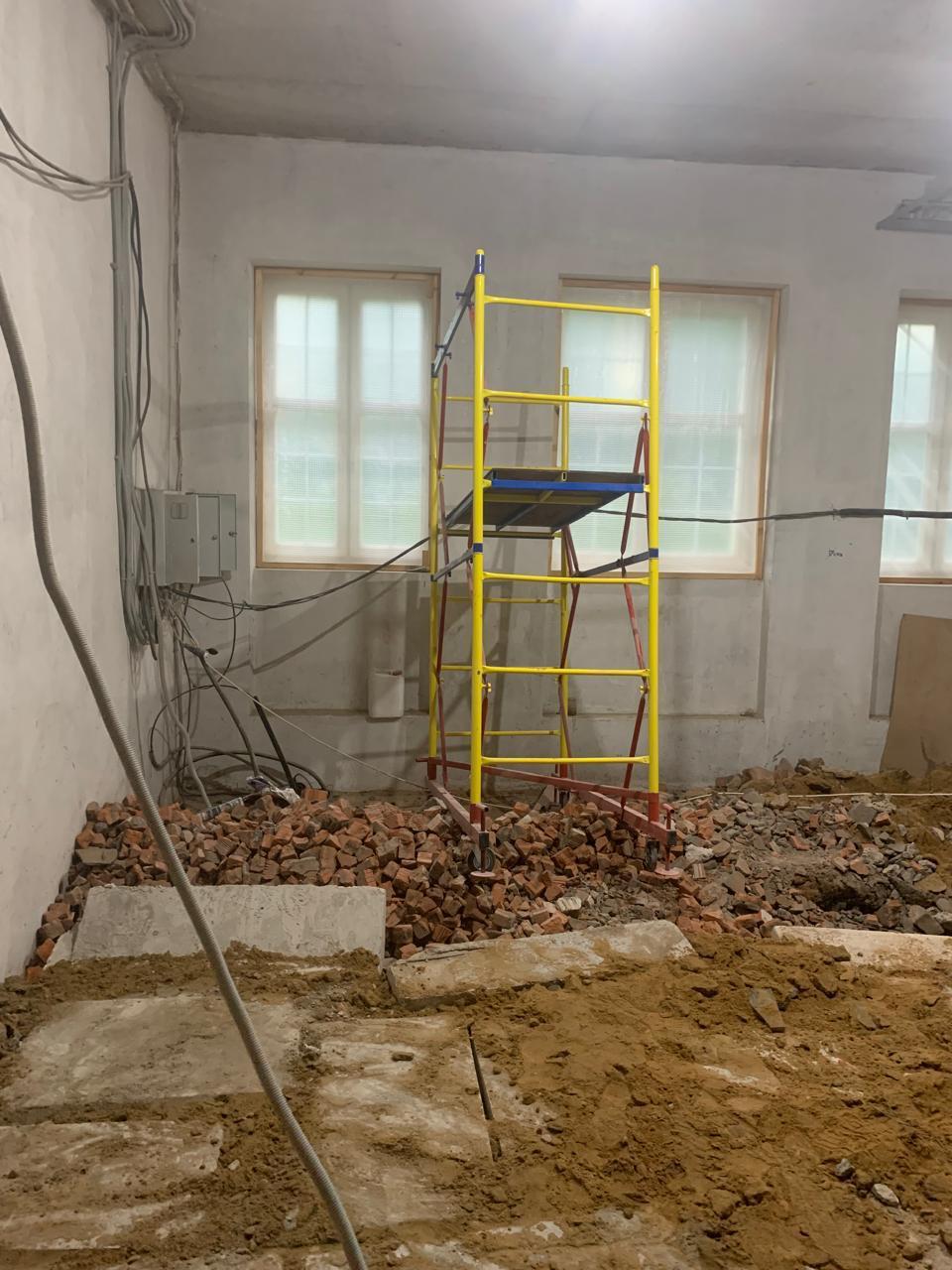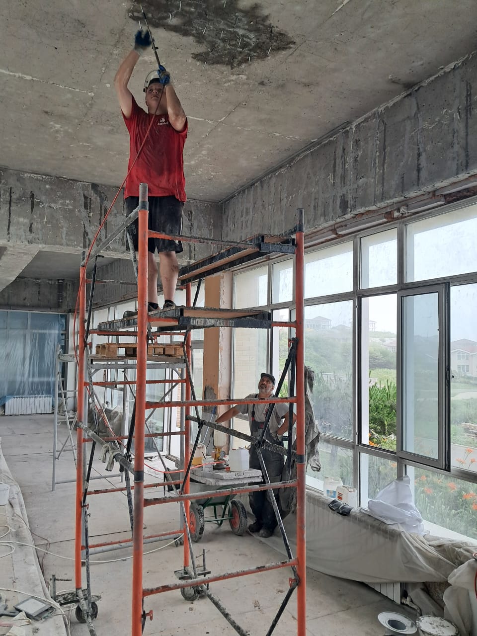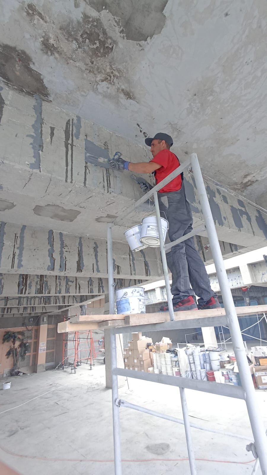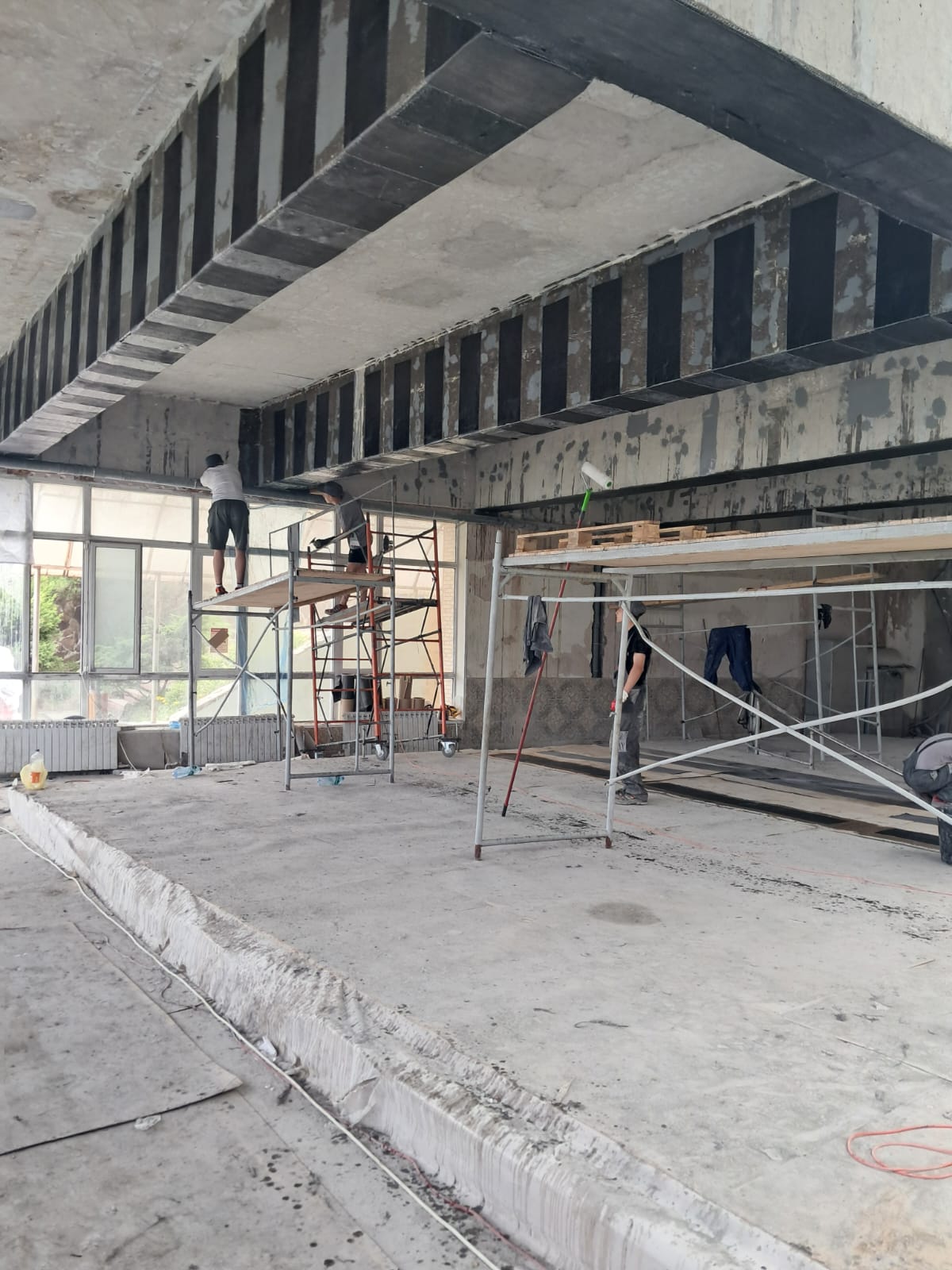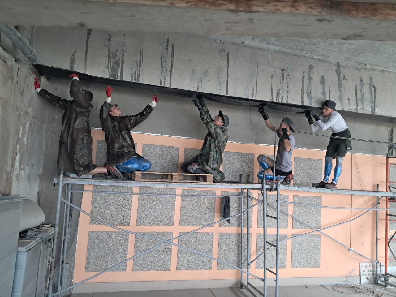 Демонтаж разрушенного защитного слоя бетона на плите перекрытия и зачистка арматуры от ржавчины. Покрытие очищенной арматуры антикорозионным составом. Усиление несущей способности ригельных балок перекрытия методом иньектирования эпоксидных смол в трещины.